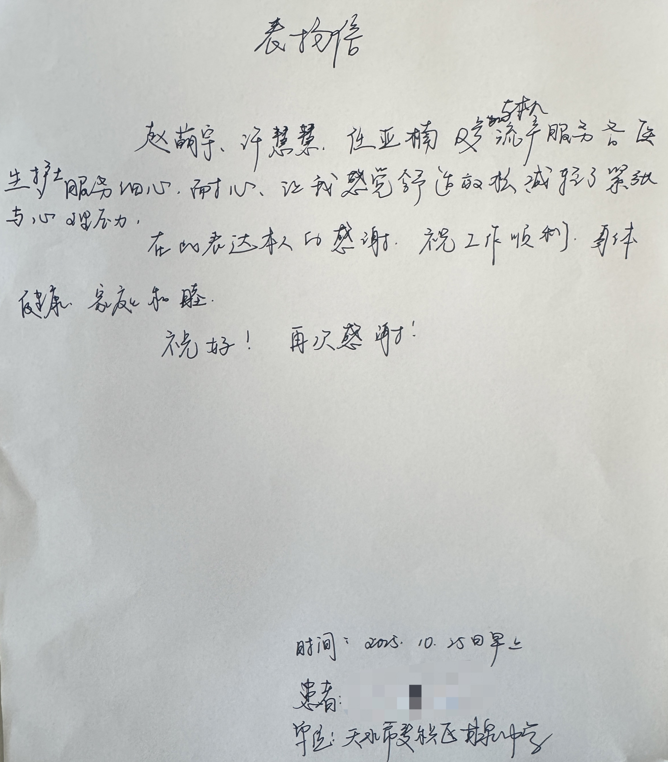 在患者近日的就诊过程中,赵萌宇、许慧慧、任亚楠三位护士及各位医护人员给予了患者无微不至的关怀。她们以极高的专业素养,提供了极其细心、耐心的服务。正是她们温柔的话语和专业的照护,极大地缓解了患者的紧张与心理压力,她们所付出的,远不止是职责所在的工作,更是一份份真诚的爱心与支持,她们是白衣天使风采的最佳体现。